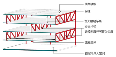 是指以預(yù)制鋼筋混凝土柱或鋼柱、鋼桁架、預(yù)制樓板等預(yù)制構(gòu)件組成的大跨度空間結(jié)構(gòu),主體結(jié)構(gòu)采用裝配式交錯桁架結(jié)構(gòu),配置外墻、內(nèi)隔墻和樓蓋系統(tǒng)的建筑。
